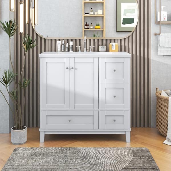 36 in. W x 18 in. D x 34 in. H Freestanding Bath Vanity in White with White Resin Top with USB Charging and Drawers