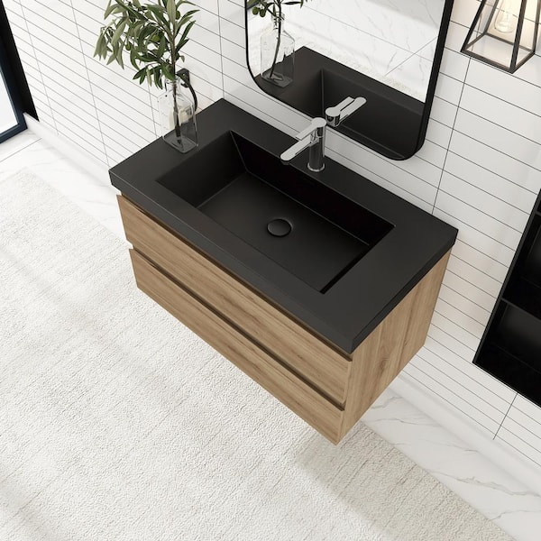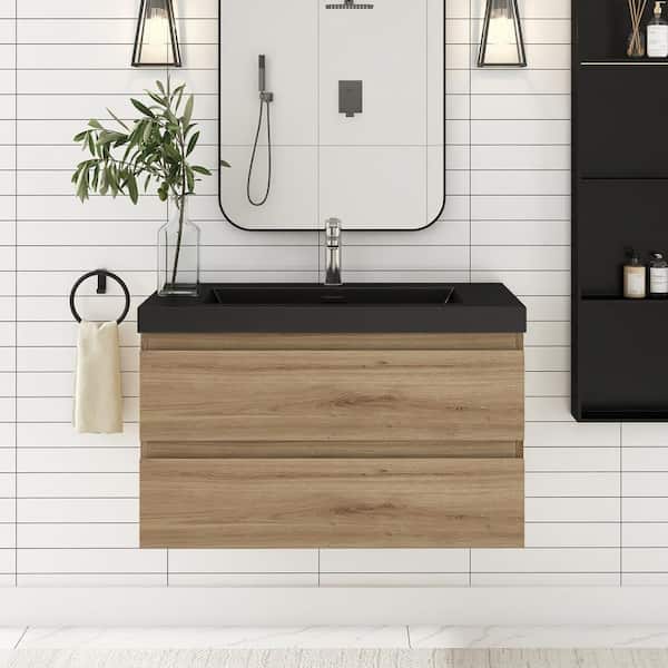 36 in. W x 19.5 in. D x 22.5 in. H Single Sink Wall Mounted Bathroom Vanity in F. Oak with Black Cultured Marble Top