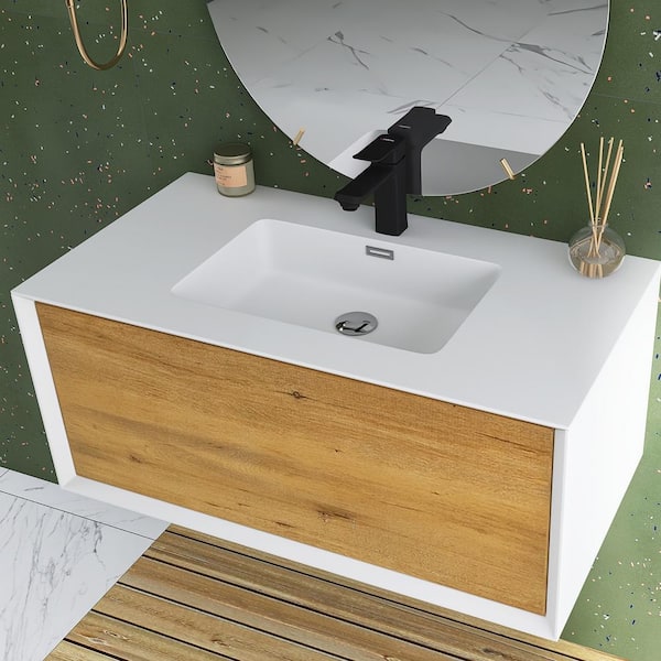 36 in. W x 19 in. D x 16 in. H Single Sink Bathroom Vanity Side Cabinet in White and Oak with White Solid Surface Top