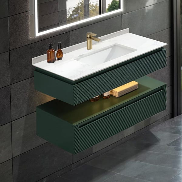 36 in. W x 20.7 in. D x 19.6 in. H Floating Single Sink Solid Oak Bath Vanity in Green with White Marble Top and Lights