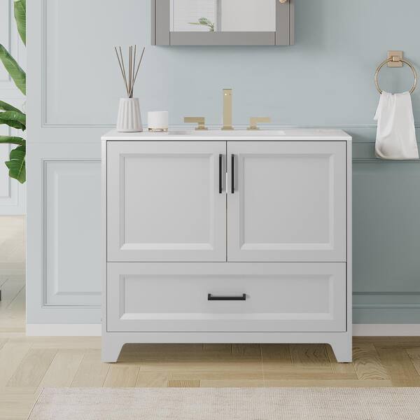 36 in. W x 22 in. D x 34 in. H Solid Wood Bath Vanity in Gray with White Solid Surface Top, Single Sink, Assembled