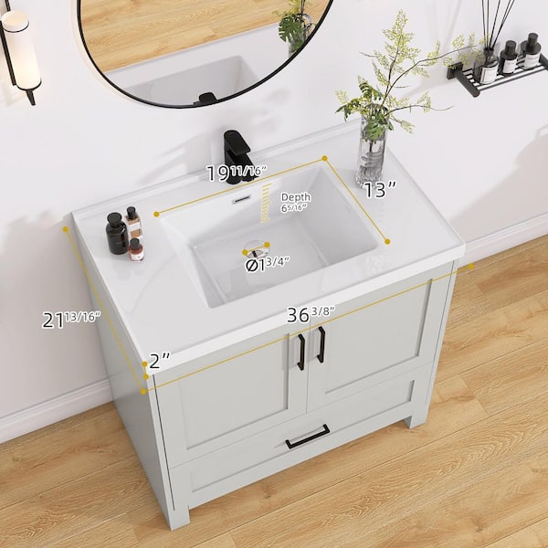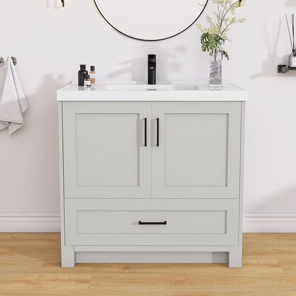 • Freestanding 36" light grey cabinet with attached 36" white top