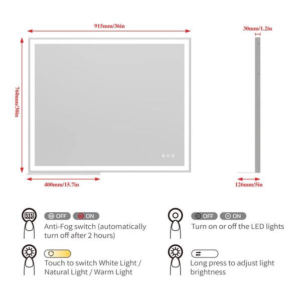 36 in. W x 30 in. H Silver Rectangular LED Anti-Fog Touch Switch Bathroom Wall Mirror with Removable Tray