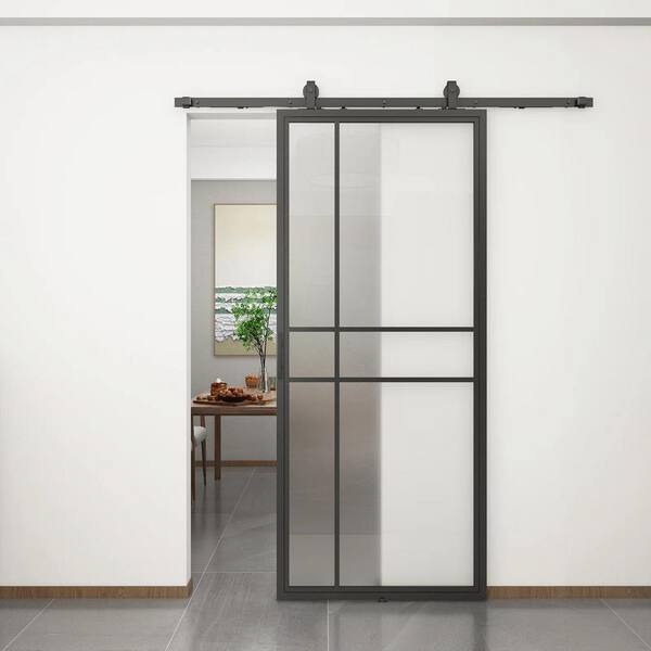 36 in. x 84 in. 1-Panel Frosted Glass Black Steel Sliding Barn Door with Hardware Kit, 1-Piece No Assembly Required