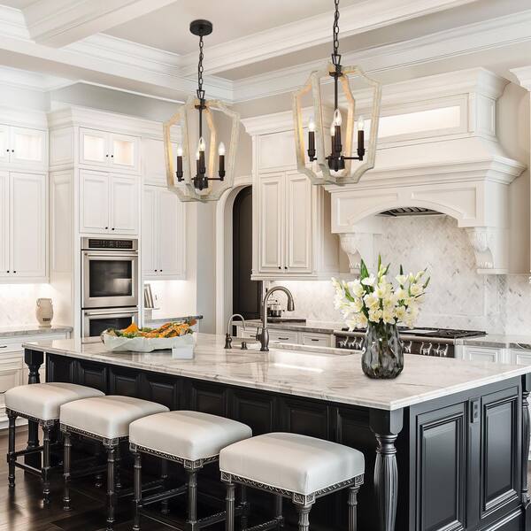 4-Light Farmhouse Chandelier with Distressed White Wood Frame and Matte Black Accents