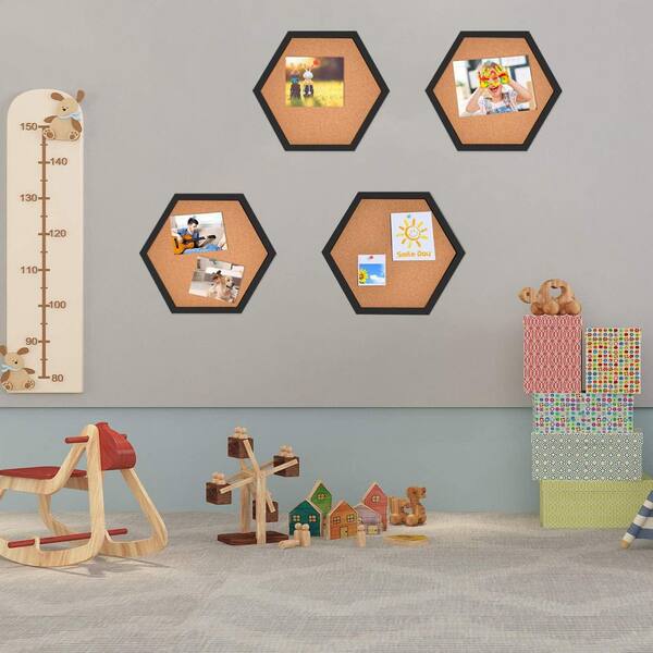 4 Pack Hexagon 13.5x11 Inch Framed Cork Bulletin Board Tiles with 16 Push Pin Wood Clips Black Thick Display Board
