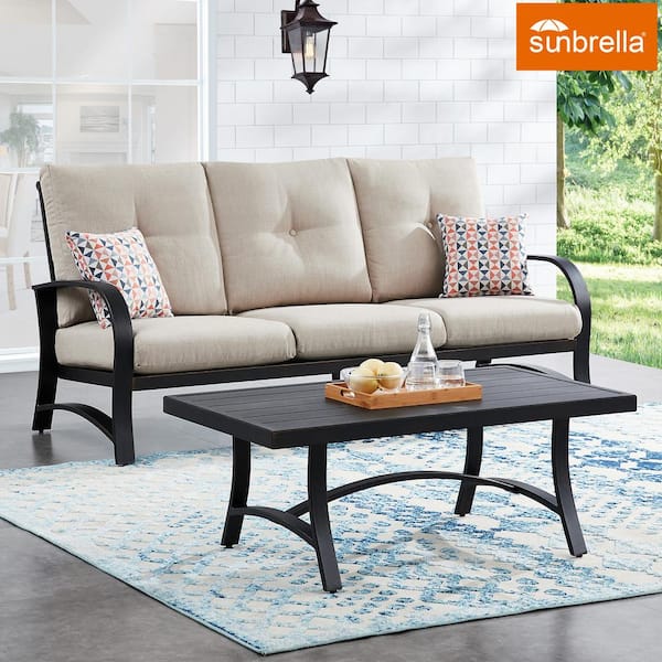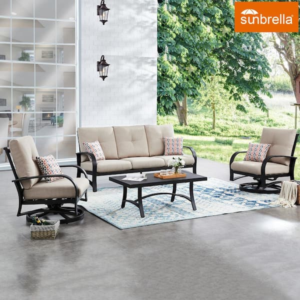 4-Piece Aluminum Patio Conversation Set with Beige Sunbrella Cushions, 2 Swivel Chairs, Sofa, Coffee Table
