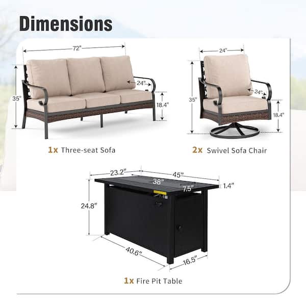 • Includes 2 chairs, 1 sofa, and fire pit table