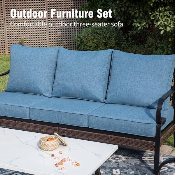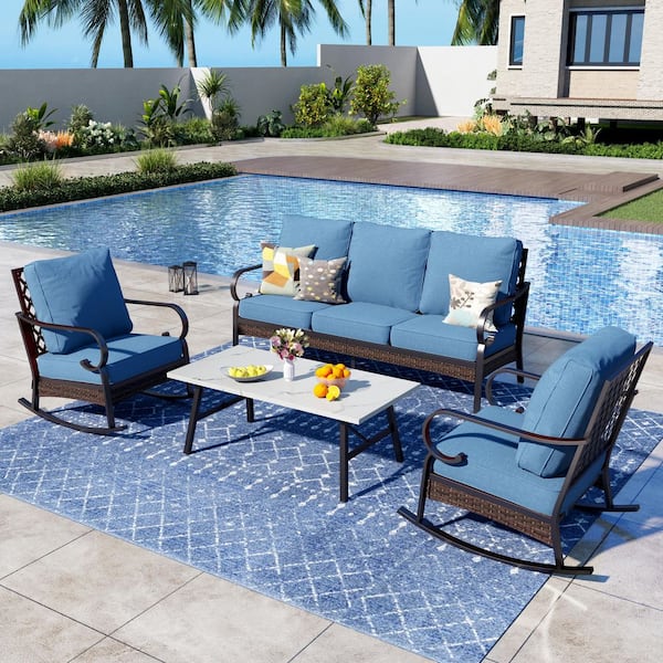 4-Piece Black Metal Outdoor Patio Conversation Set with Rocking Chairs, Marbling Coffee Table and Denim Blue Cushions