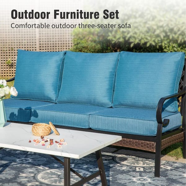 4-Piece Black Metal Outdoor Patio Conversation Set with Swivel Chairs, Marbling Coffee Table and Pacific Blue Cushions