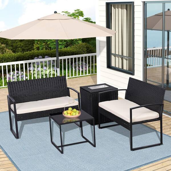 4-Piece Black Wicker Patio Conversation Set w/ Removable Ice Bucket and Beige  Cushions, Loveseat, Table