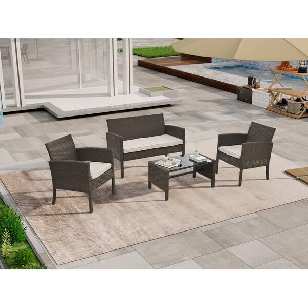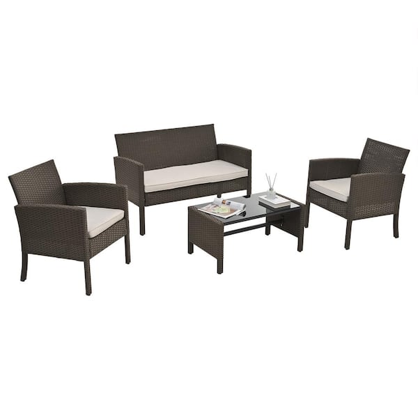 4-Piece Brown PE Ratten Wicker Patio Outdoor Conversation Set with Beige Cushion and Table for Backyard, Garden, Porch
