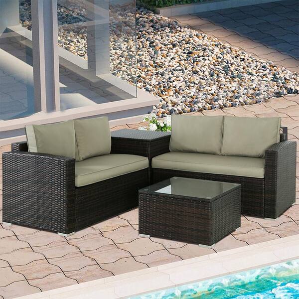 4-Piece Brown Wicker Outdoor Patio Sectional Sofa Set with Khaki Cushions, Storage Box for Garden Balcony Backyard