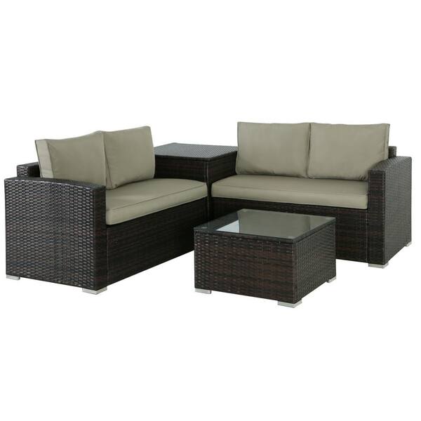 4-Piece Brown Wicker Rattan Outdoor Sectional Sofa Set with Storage Box Grown and khaki Cushions