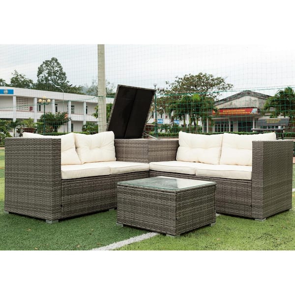 4 Piece Brown Wicker Rattan Patio Outdoor Sectional Sofa Set with Storage Box Creme Cushions