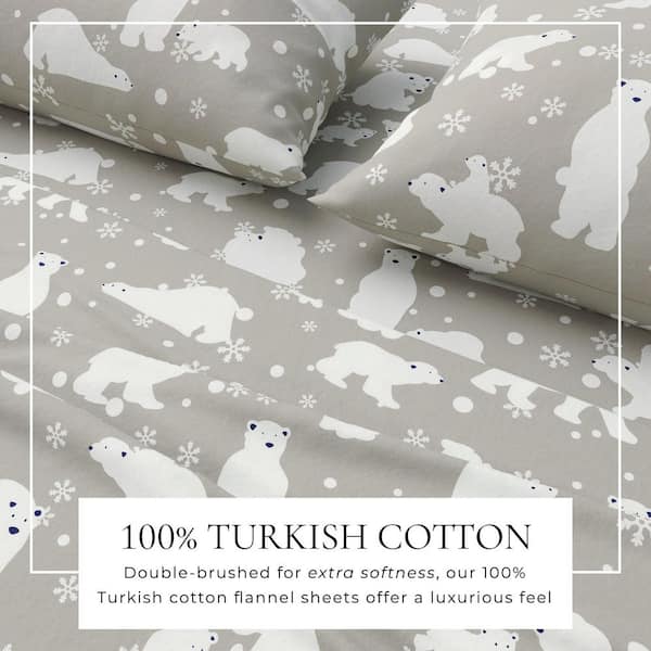 4-Piece Gray Holiday Themed 100% Turkish Cotton Queen Premium Flannel Sheet Set