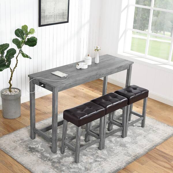 4-Piece Gray MDF Wood Rectangular Outdoor Dining Set with Brown Cushions