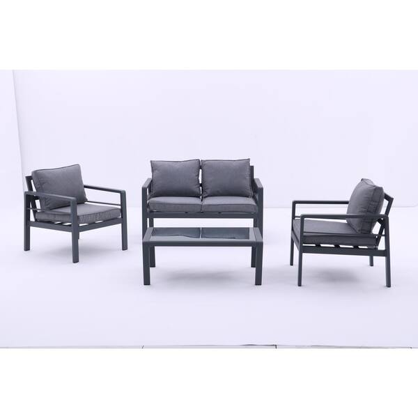 4-Piece Grey Aluminum Outdoor Conversation Set with Grey Removable Cushions and Tempered Glass Coffee Table