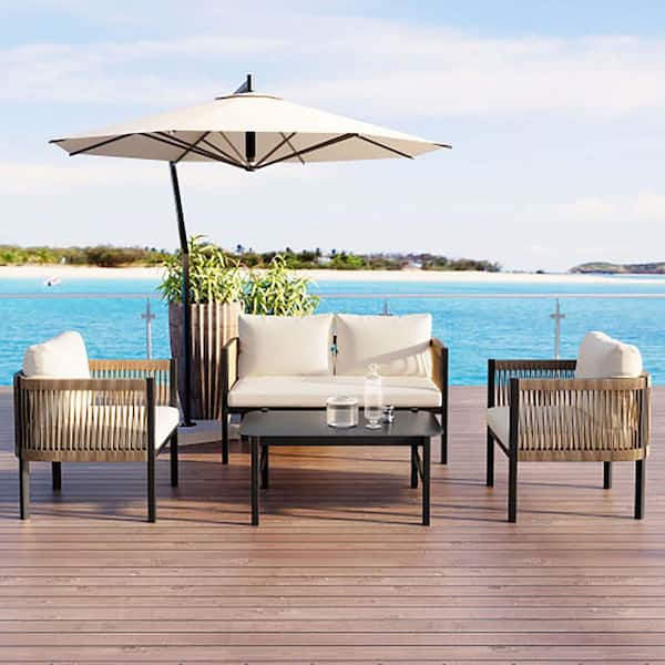 4-Piece Metal Patio Conversation Set with Beige Cushions, Outdoor Chairs and Loveseat with Coffee Table for Porch, Yard