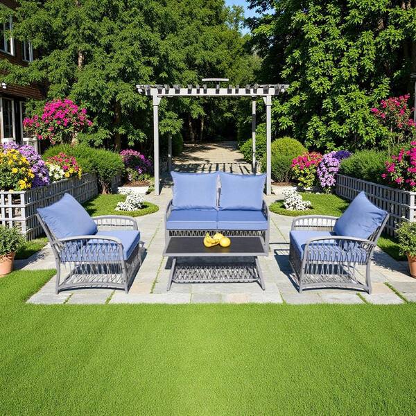 4-Piece Metal Patio Conversation Set with Blue Cushions