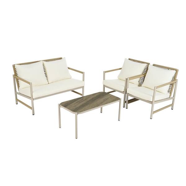4-Piece Metal Patio Outdoor Sectional Set with Beige Cushions and Tempered Glass Tabletop for Garden Poolside Balcony