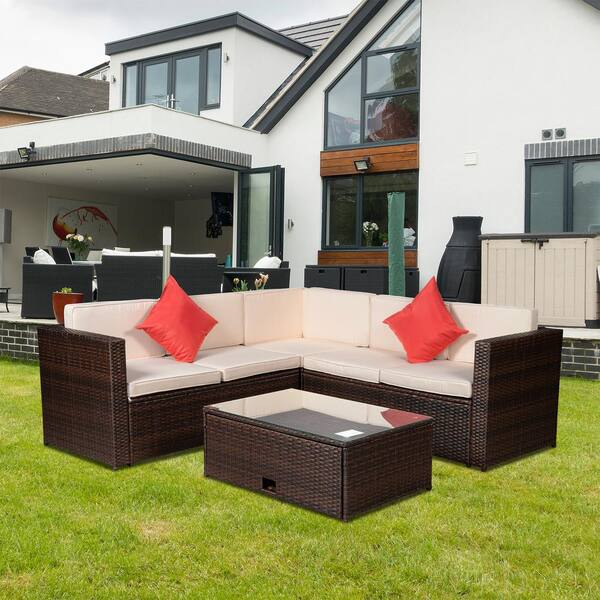 4-Piece PE Rattan Wicker Outdoor Sectional Set with Beige Cushions and Table Patio Furniture Sets Garden Sofa Sets