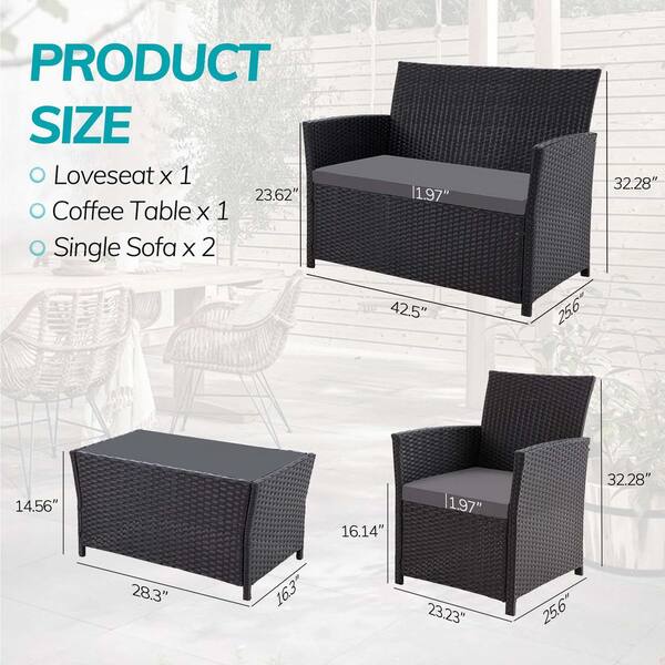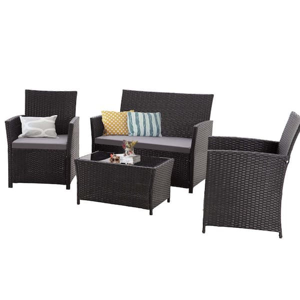4 Piece Wicker Outdoor Conversation Set Sectional Sofa Couch Set with Gray Cushions Tempered Glass Coffee Table, Black