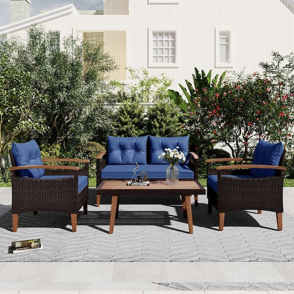 4-Piece Wicker Outdoor Garden Furniture, Patio Seating Set, Patio Sectional Set, Wood Table and Legs, with Blue Cushions