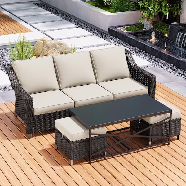 4-Piece Wicker Outdoor Patio Conversation Set with Beige Cushions and Ottoman
