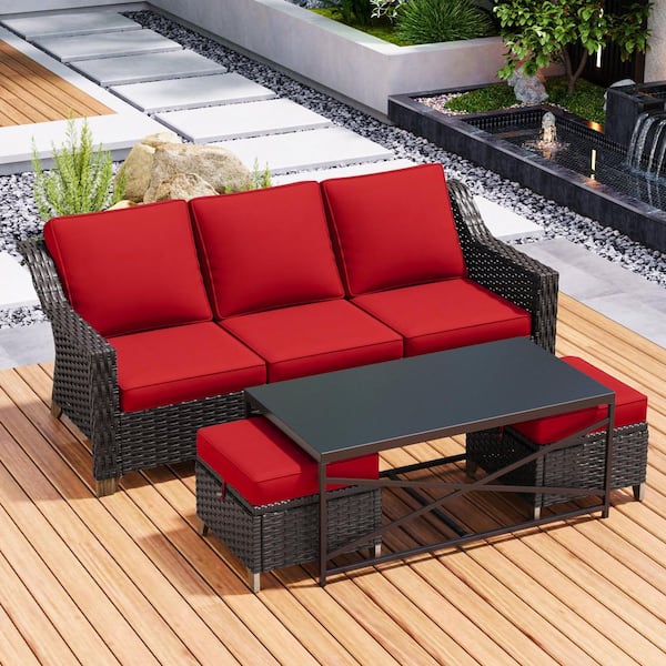4-Piece Wicker Outdoor Patio Conversation Set with Red Cushions and Ottoman