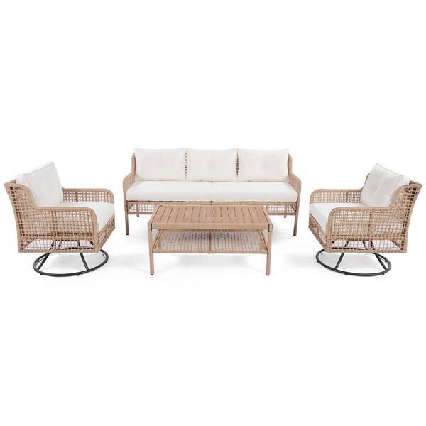 4-Piece Wicker Outdoor Sectional Set, Patio Furniture Set with Beige Cushions, Swivel Chairs