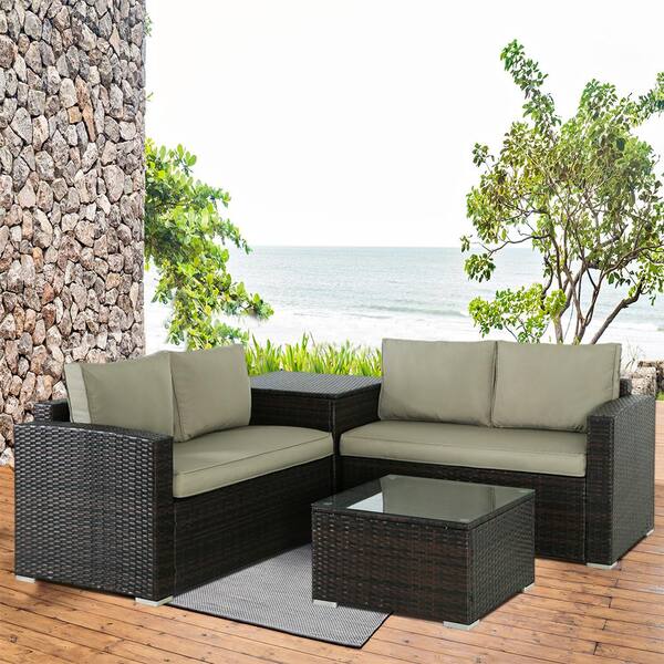 4-Piece Wicker Outdoor Sectional Set Patio Furniture Set with Khaki Cushions and Coffee Table for Bistro Porch Yard