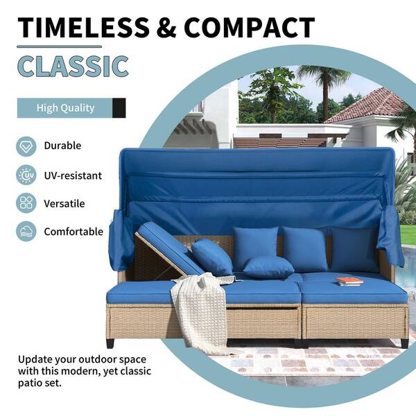4 Piece Wicker Outdoor Sectional Set with Retractable Canopy, Blue Cushions and Lifting Table