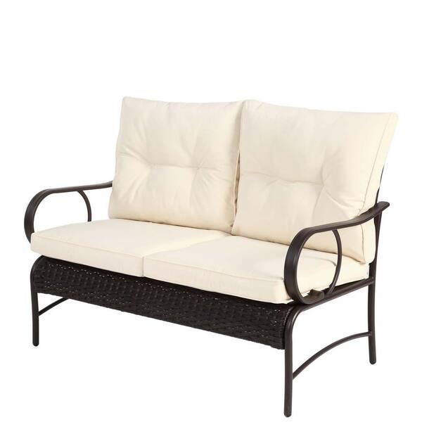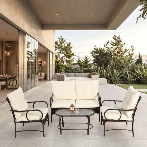 4-Piece Wicker Patio Conversation Set Outdoor Sofa Patio Furniture Set with Glass-Top Coffee Table and White Cushions