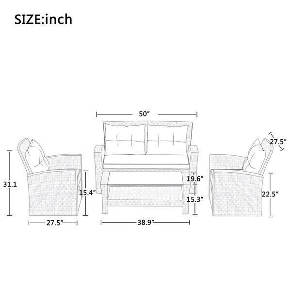 4-Piece Wicker Patio Conversation Set with Beige Cushions and Ottoman