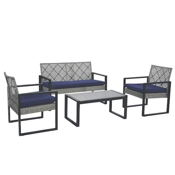 4-Piece Wicker Patio Conversation Set with Blue Cushions, Patio Furniture Set Outdoor Balcony Porch Garden Backyard Lawn