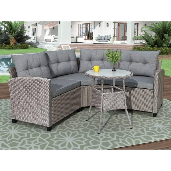 4-Piece Wicker Patio Conversation Set with Gray Cushions and Round Table