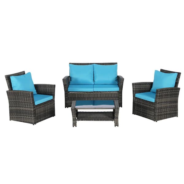 4-Piece Wicker Patio Conversation Set with Light Blue Cushions and Coffee Table