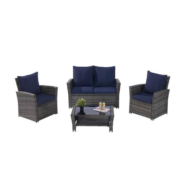 4-Pieces Gray Rattan Outdoor Patio Conversation Set with Dark Blue color Cushions, Garden Rattan Chair Wicker Set