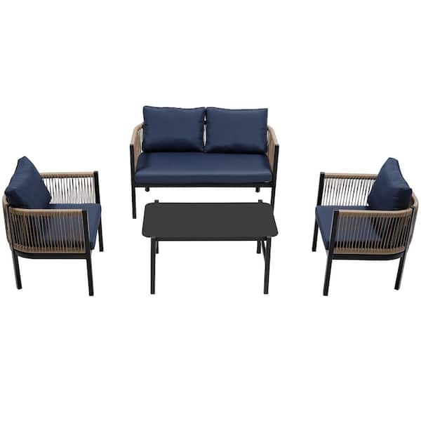 4 Pieces Metal Patio Conversation Set with Tempered Glass Table and Dark Blue Cushions for Garden Backyard and Balconies