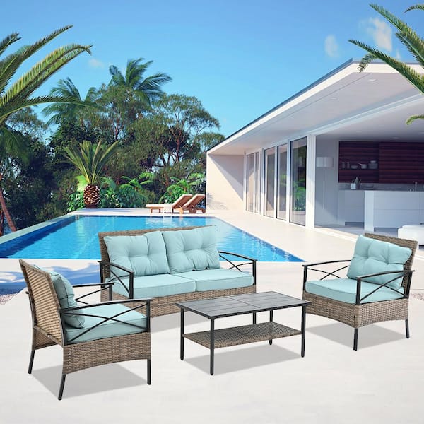 4-Pieces PE Wicker Patio Conversation Set, Outdoor Furniture Sofa, With Metal Table and Light Cyan Cushions