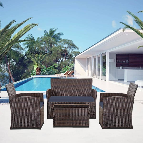 4 Pieces Wicker Patio Conversation Set, Patio Furniture Sets with Blue Cushionsfor Porch, Poolside, Garden