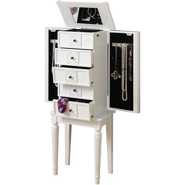 40 in. H x 16 in. W x 10 in. D Wood Jewelry Armoire in White w\ Mirror & Drawers, Side Door w\ Hooks & Velvet Lined