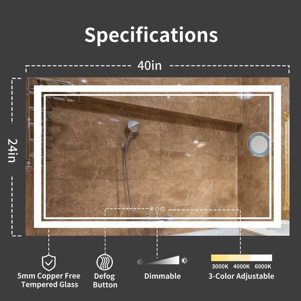 40 in. W x 24 in. H Rectangular Frameless LED Wall Mount Anti-Fog Modern Decorative Bathroom Vanity Mirror