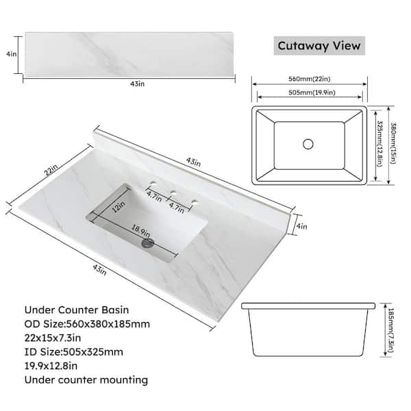 43 in. Undermount Marble Rectangular Bathroom Sink in White with 4 in Height Backsplash and Pre-drilled Faucet 3 Holes