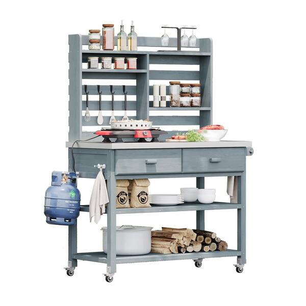46.7 W x 65 in. H Grey Blue Wood Outdoor Potting Bench Table Grill Cart with Lockable Wheels and Stainless Steel Top