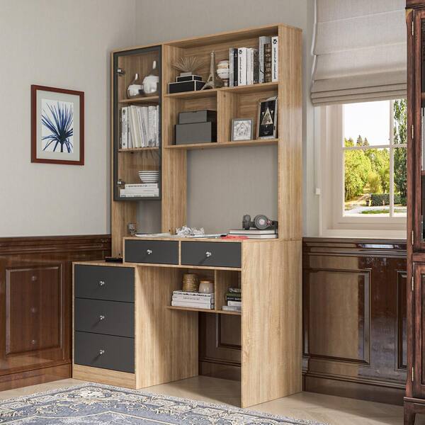 47 in. Rectangular Brown Wood Writing Desk Workstation with Bookcase, Glass Door, 5-Drawers