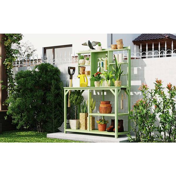 47 in. W x 19 in. D x 65 in. H Green Solid Wood Outdoor Storage Cabinet, Potting Table with Shelves Tabletop Side Hook