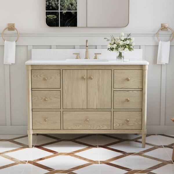 48 in. Oak Solid Wood Bath Vanity White Quartz Top, Single Sink, Soft-Close Doors, Drawers, CUPC Certified, Assembled