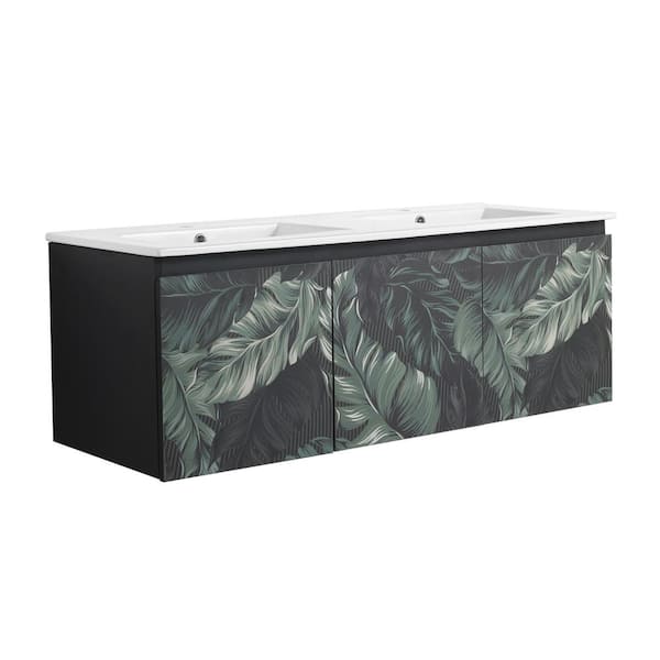 48 in. W x 18.30 in. D x 17.30 in. H Dual Sink Wall-Mounted Bath Vanity in Feather Pattern with White Ceramic Sink